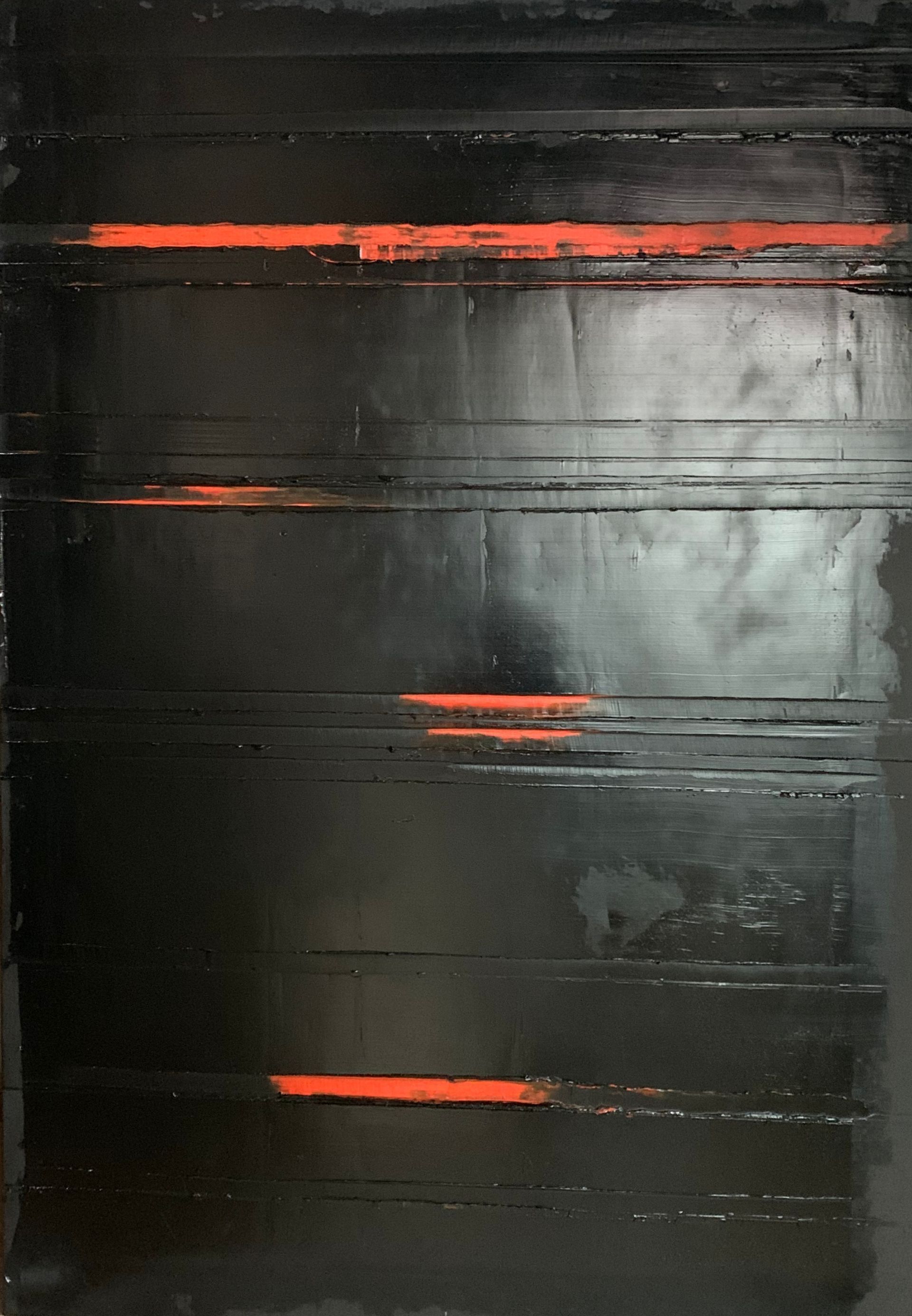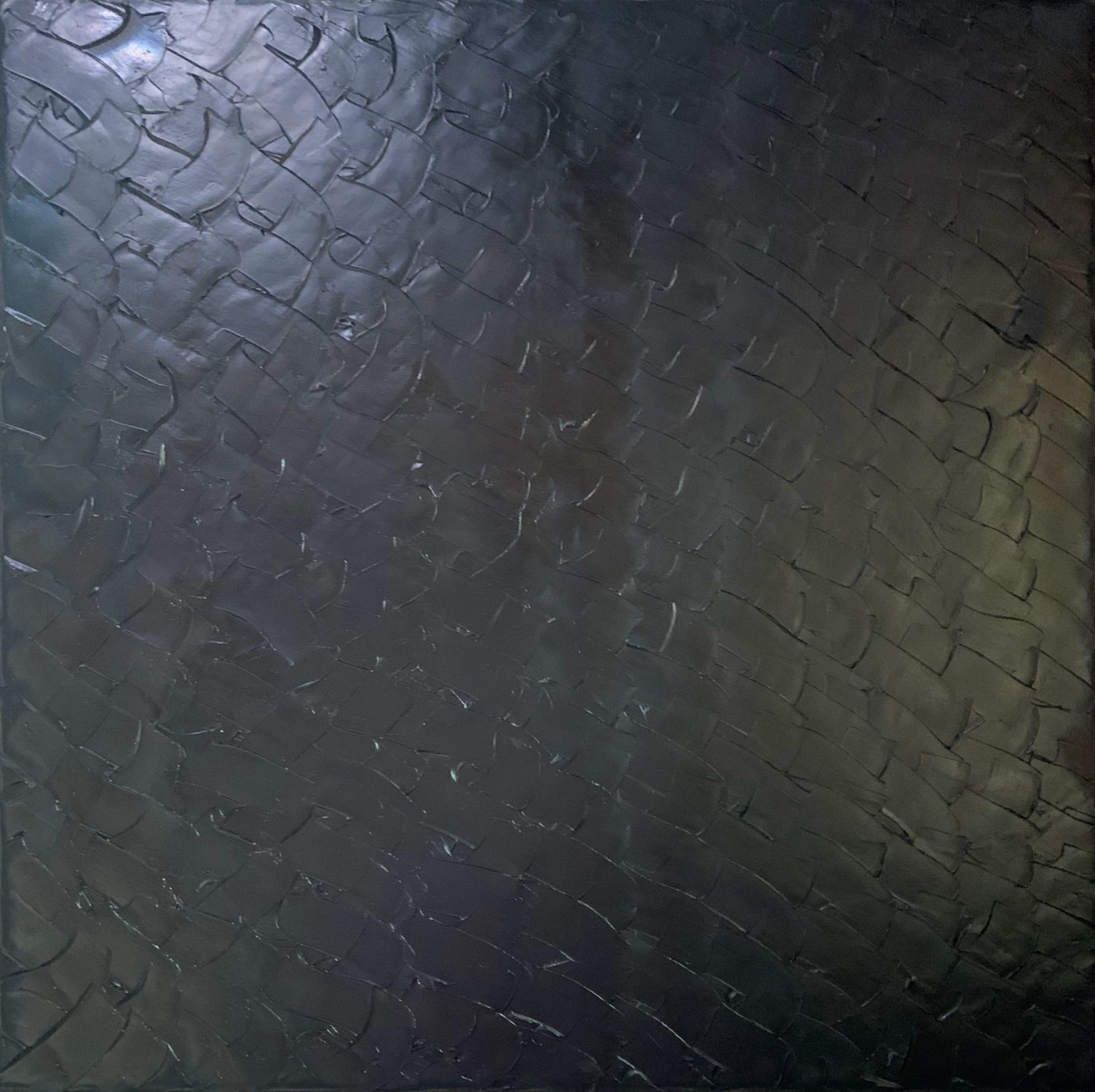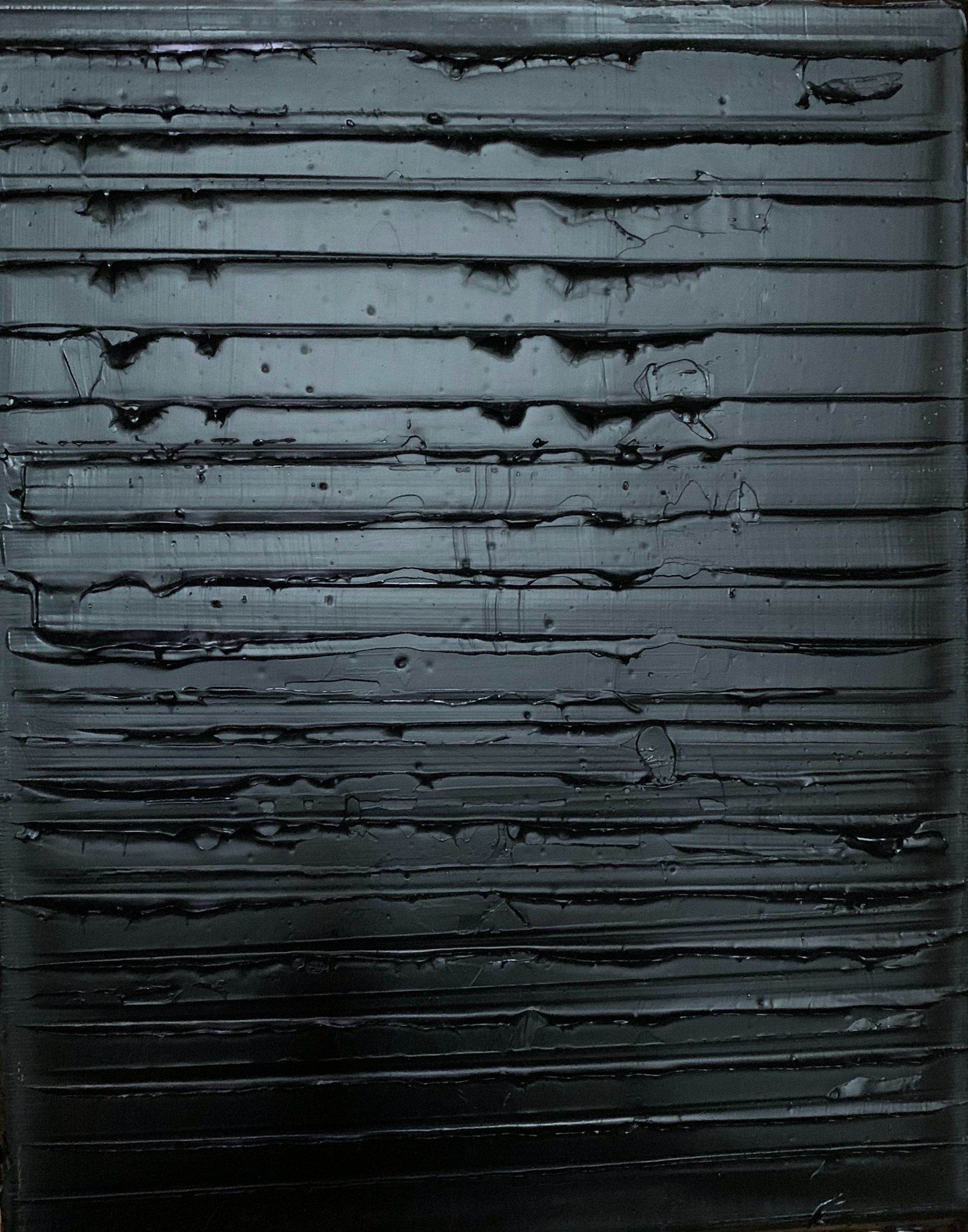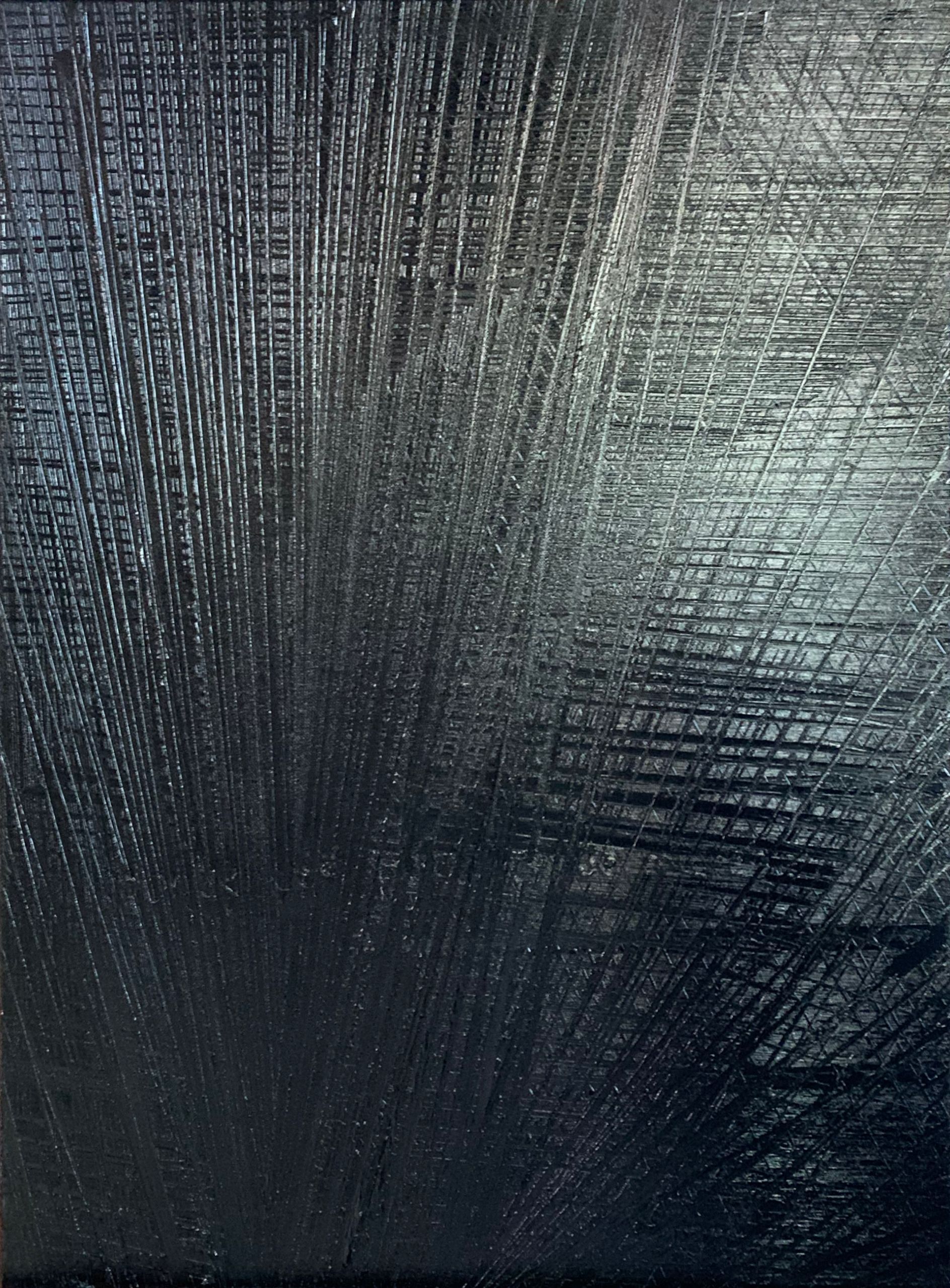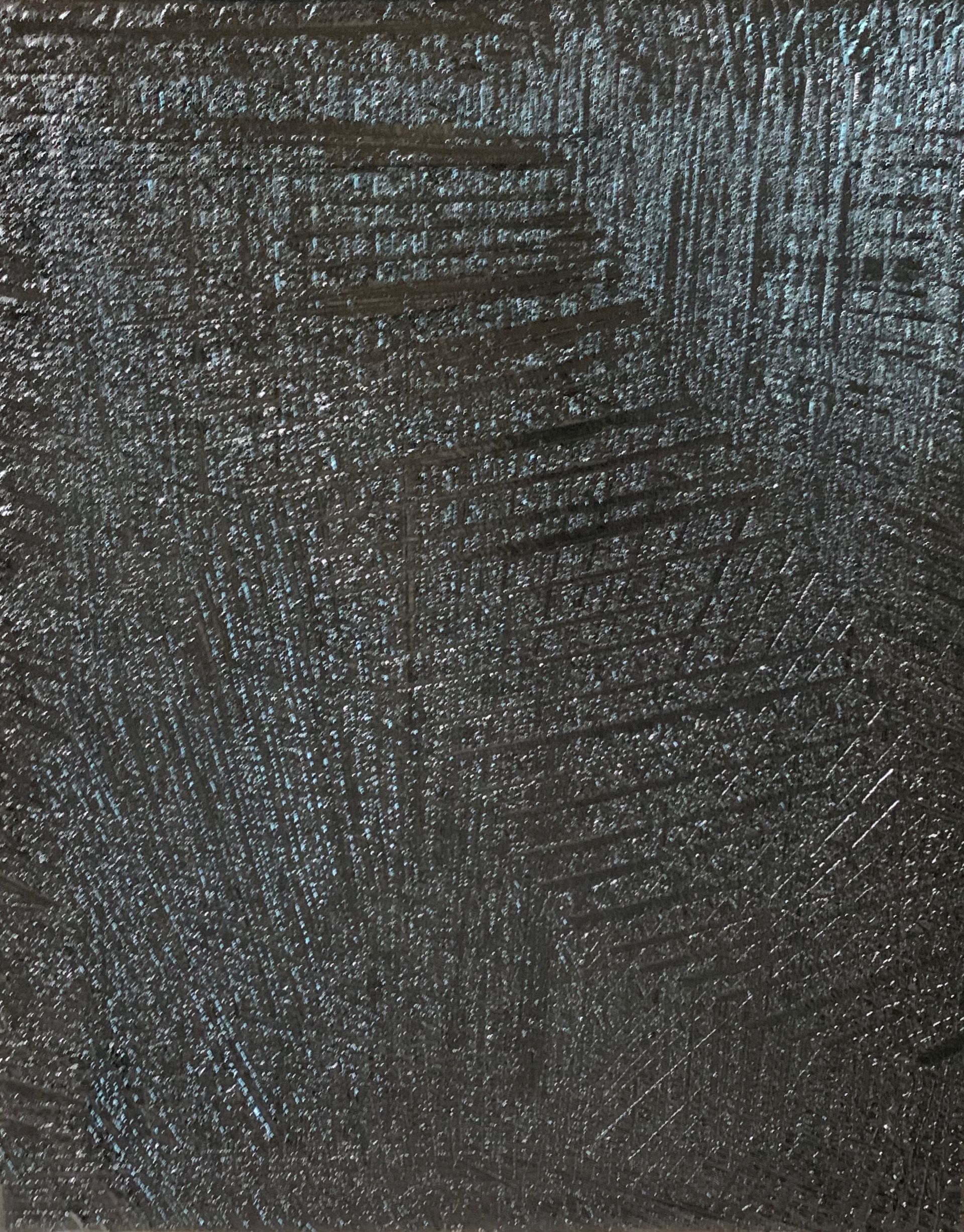Je fige, sculptant ce noir obscur et silencieux, un dédale de signes organisés, scarifications, traces, cicatrices, ou certaines sensations rythmées ou lentes, précises ou incertaines, non plus par la couleur mais par la matière ou son épaisseur.