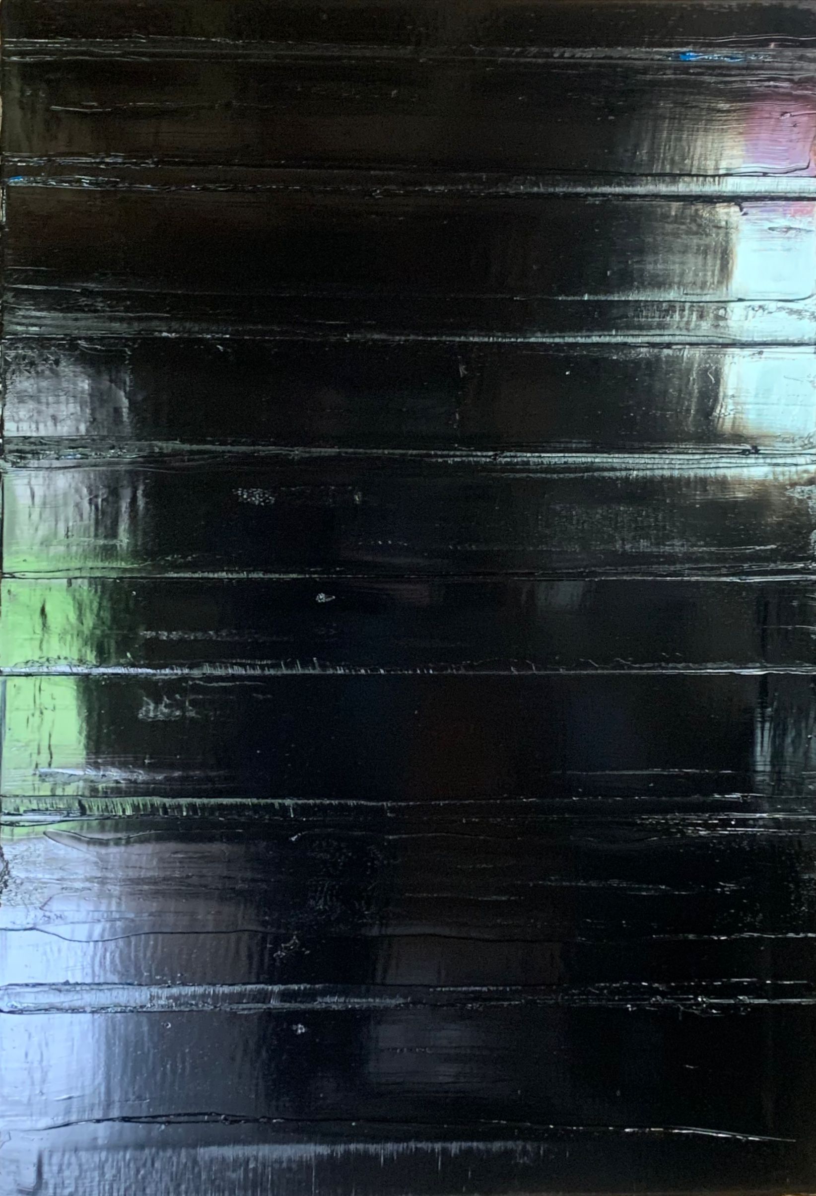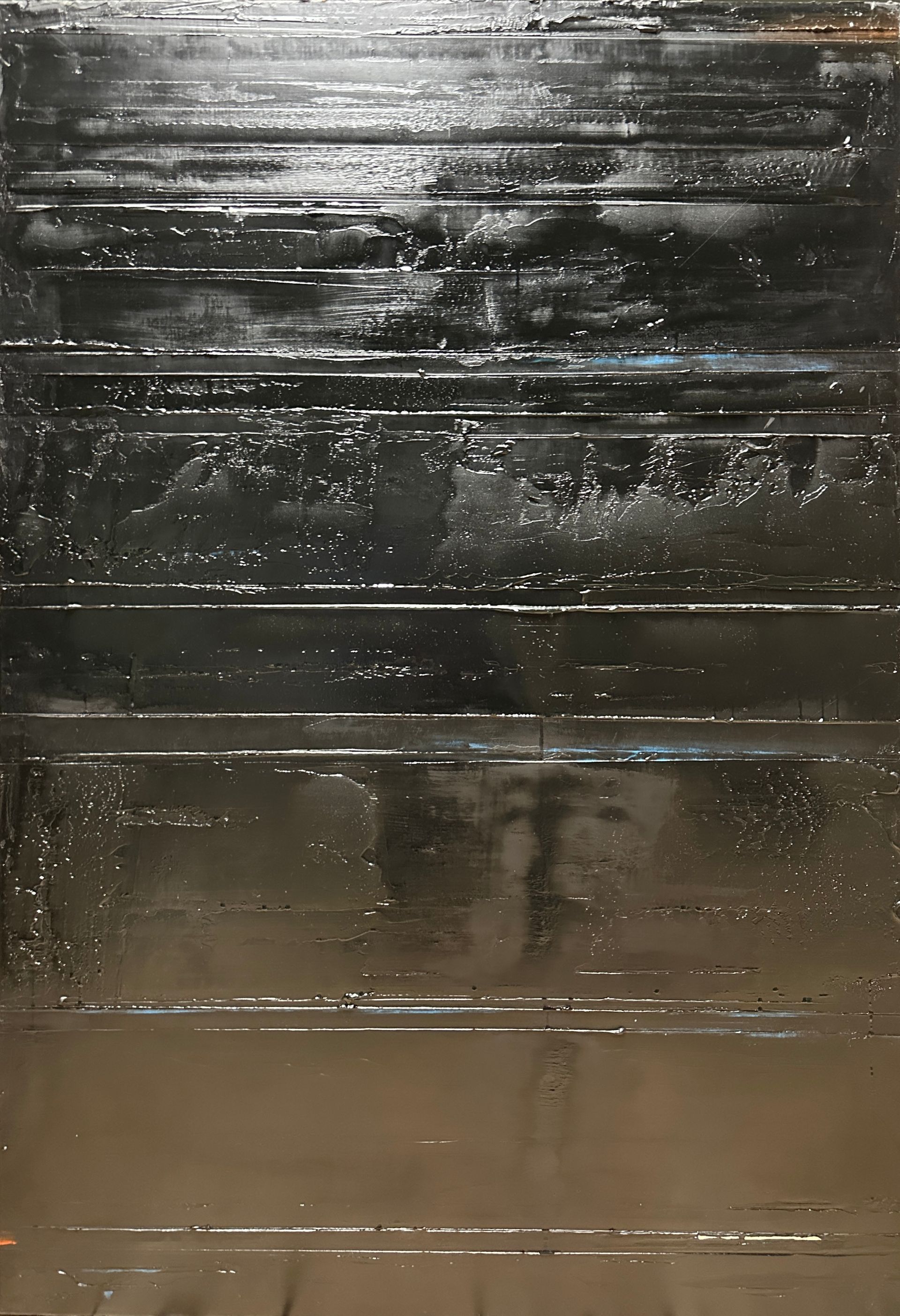 Je forme et enfouis alors mes strates de peinture inversées. Puis, tel un archéologue, en gratte les surfaces, explore, pour mettre à jour dans ces noirs profonds, ces instants passés,
