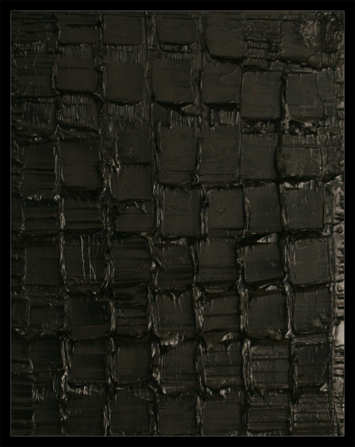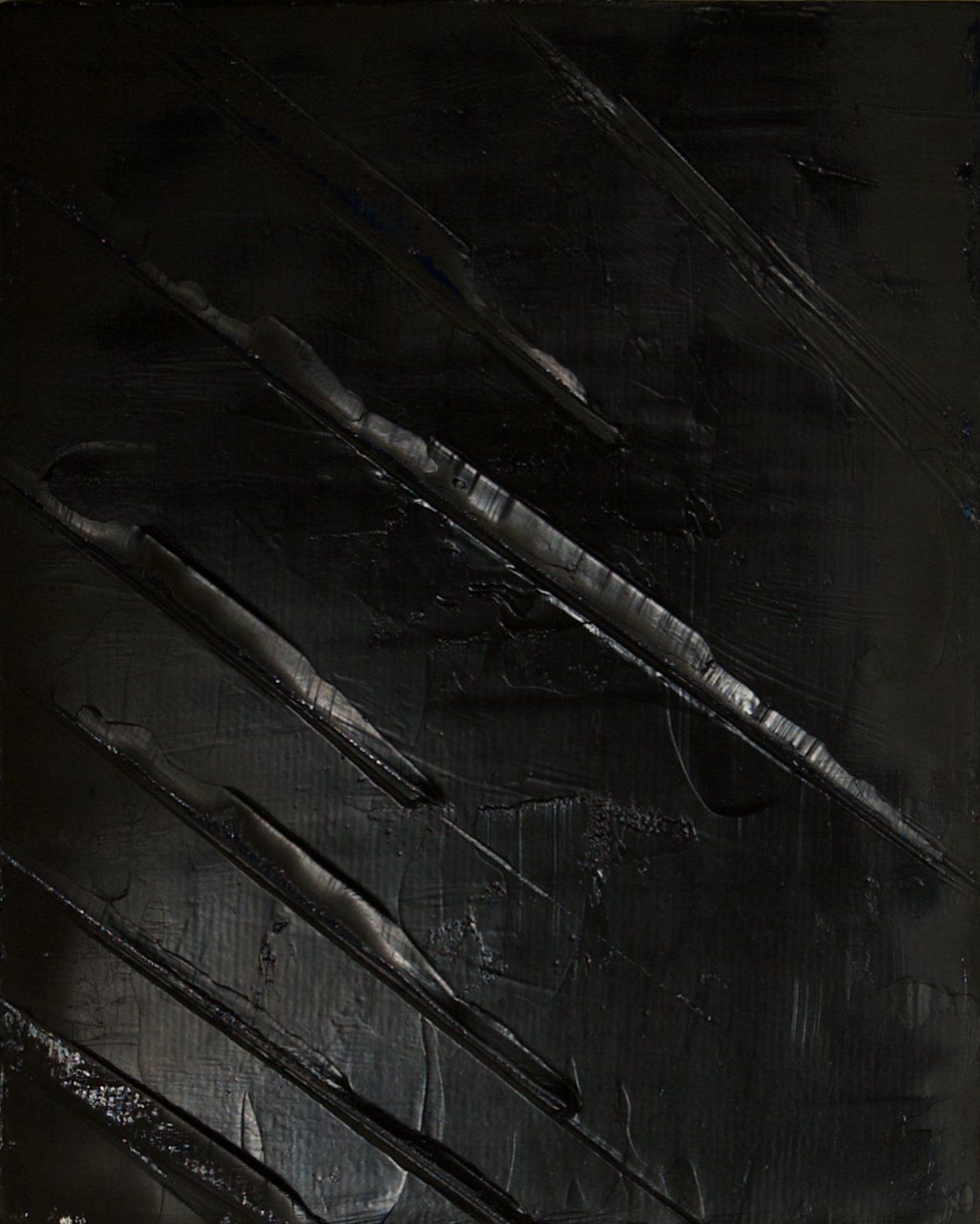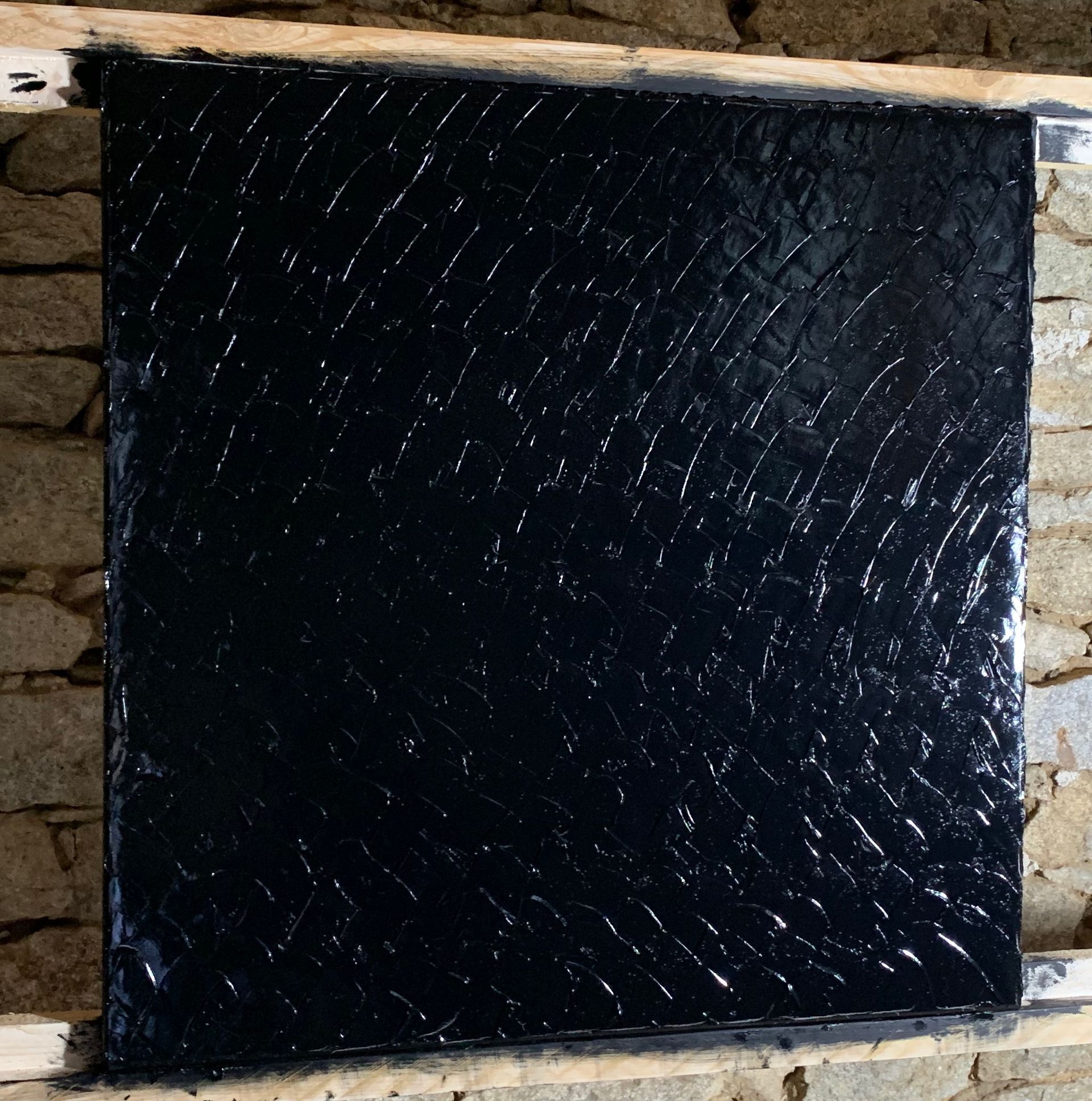 I then create and bury my layers of inverted paint. Then, like an archaeologist, I scrape the surface, explore to reveal in these deep blacks, these past instants and (re)discover my memories. While sculpting these silent dark blacks, I freeze a maze of organized signs, scarifications, traces, scars, or sensations, some rhythmic or slow, some precise or uncertain, not by the color anymore but by the material or its thickness.